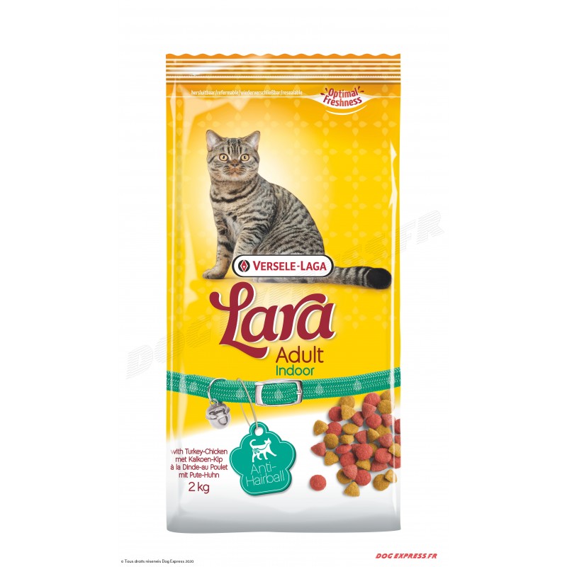 • Lara Adulte Indoor est un aliment complet pour chats adultes d'un an et plus.