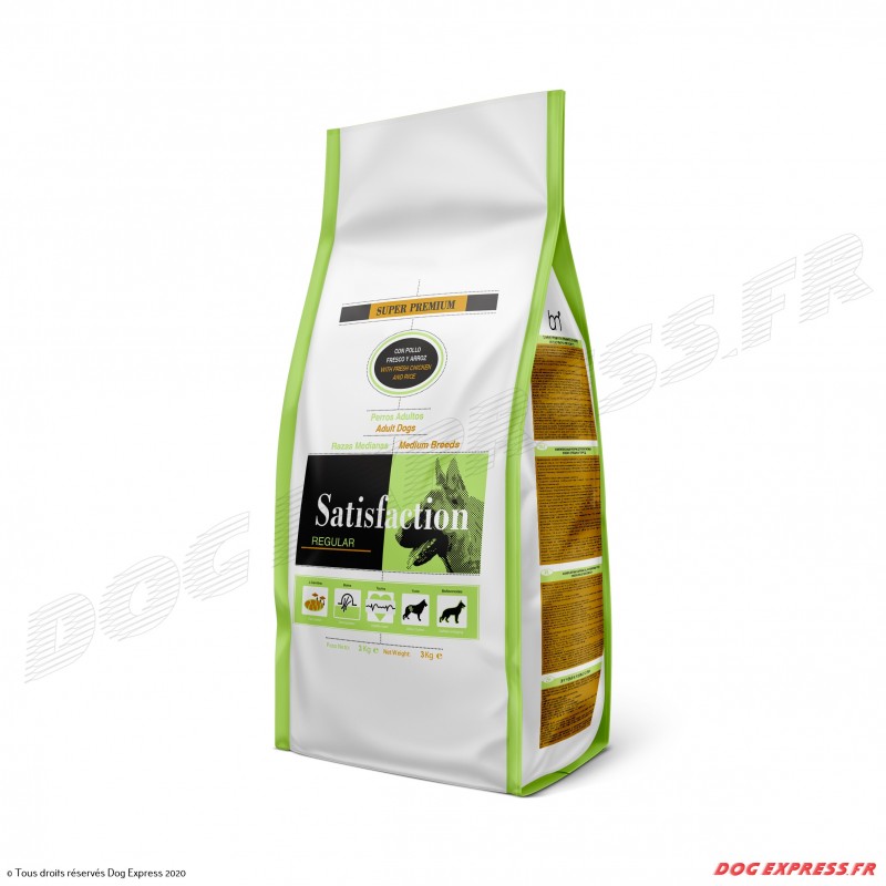 SATISFACTION SUPER PREMIUM REGULAR MEDIUM est un aliment idéal pour les chiens adultes (de 1 à 7 ans) de races moyennes (de 10 à 25 kg de poids adulte).