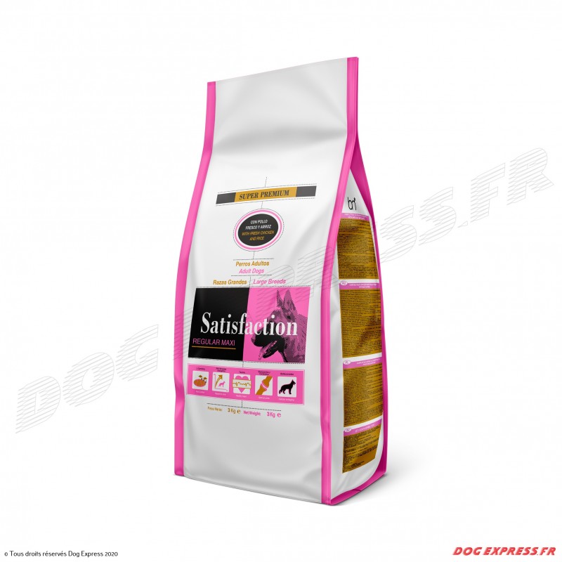 SATISFACTION SUPER PREMIUM MAXI REGULAR, est un aliment spécialement indiqué pour les chiens adultes (de 1ans1/2 à 7 ans) de grande taille (plus de 25 kg.).